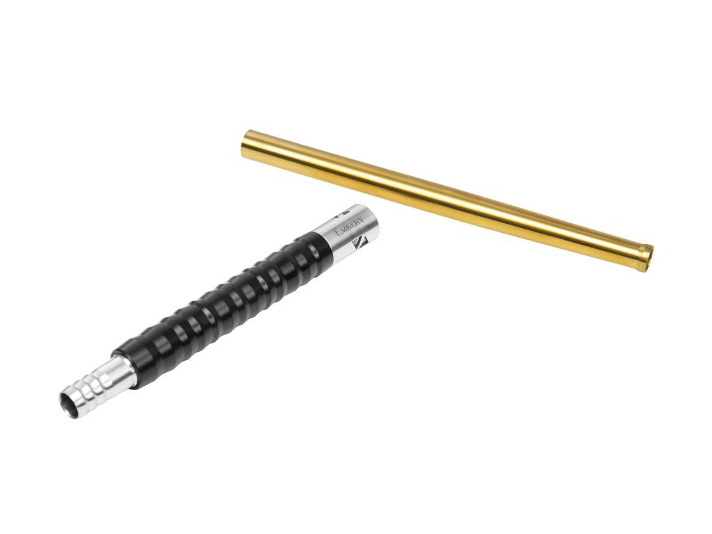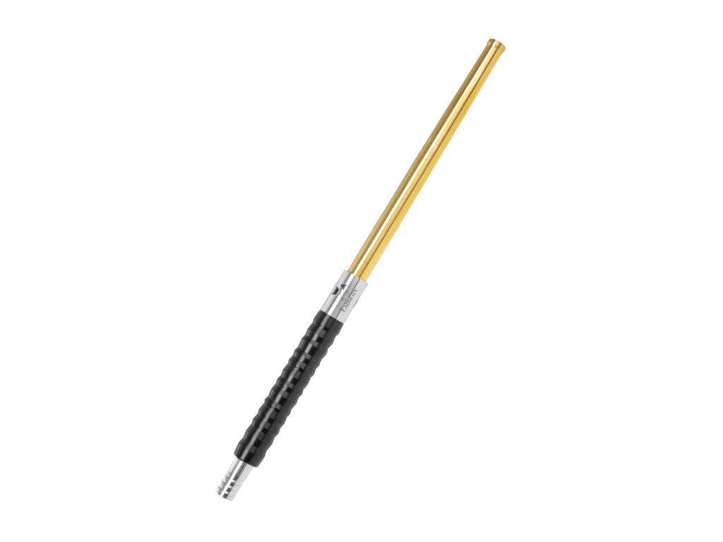 Základ tvoří nerezová ocel a náustek je řešený jako 2dílná konstrukce spojená závitem. To je praktické hlavně na cestování – jednoduše ho rozšroubuješ, zkrátíš a uložíš do tašky k dýmce, takže se hodí i k menším (mini) dýmkám. Pohodlí při držení zajišťuje geometrický, žebrovaný overlay z POM (potravinářský plast) – neklouže v ruce, dobře se drží i při delší session a zároveň se snadno udržuje. Design dotahuje dekorativní perforovaný kroužek a stříbrno-zlaté provedení, které dodá celé sestavě luxusní, čistý vzhled.
