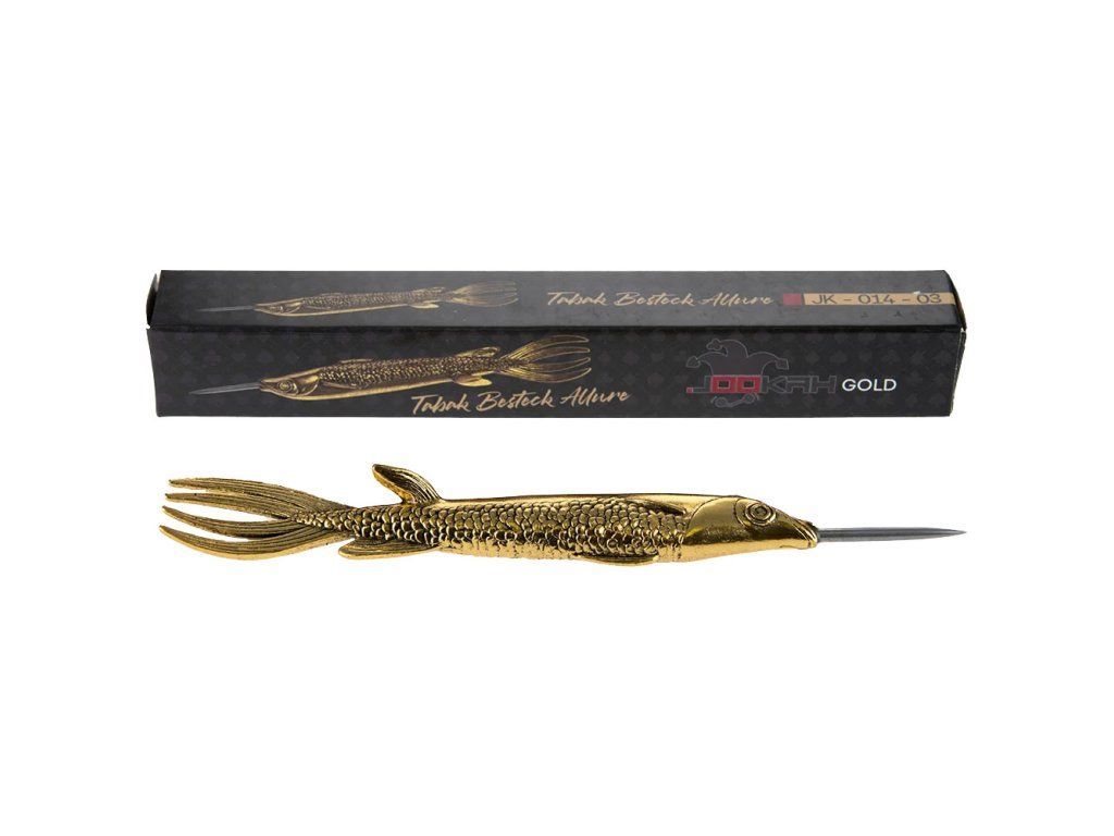 Jookah Shisha Tabak Besteck Allure Gold je dýmkařské náčiní, které řeší dvě věci najednou: precizní práci s tabákem a prémiový vzhled příslušenství. Tělo nástroje je navržené v elegantním „fish“ designu – detailní reliéf šupin není jen na efekt, ale hlavně pro jistější grip, takže se ti nástroj nebude protáčet ani při práci s lepivější směsí.