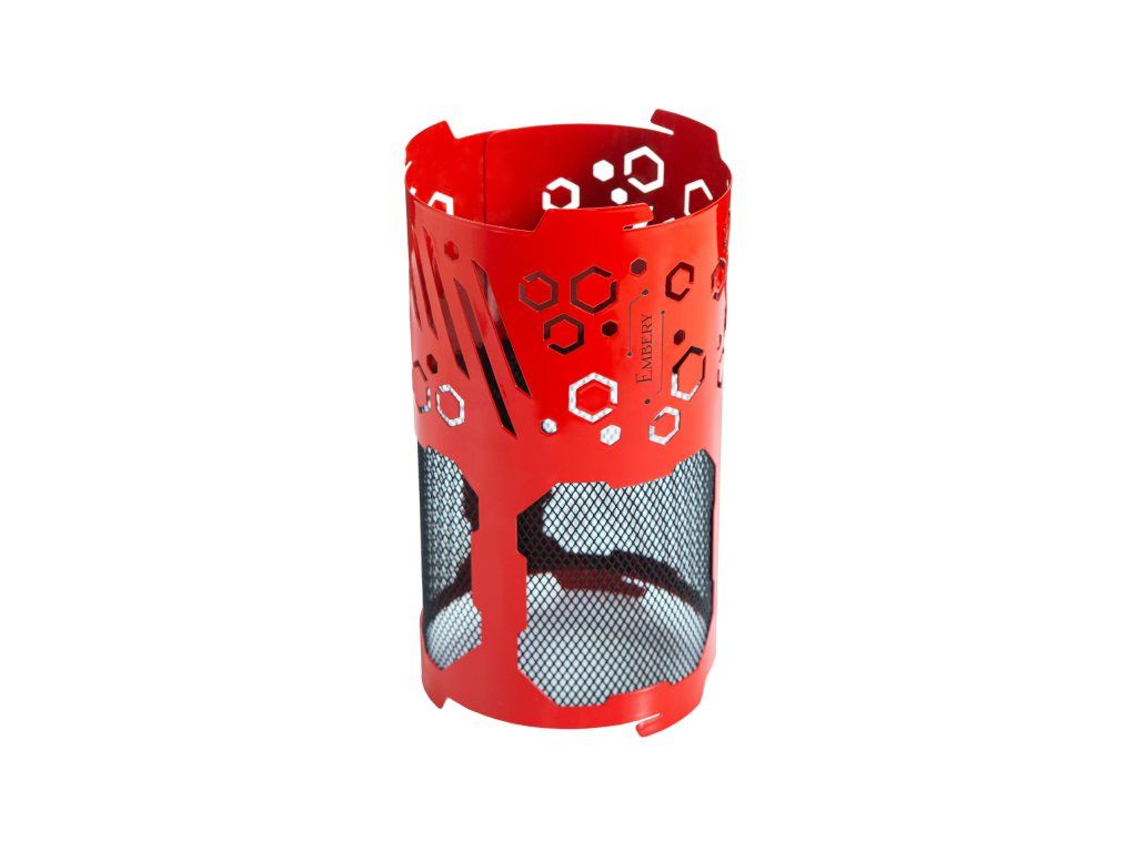 Tělo je z nerezové oceli a povrch je krytý odolnou polymerovou barvou, která zvládá vysoké teploty. Rozměrově je MeshCover univerzální: výška 200 mm a průměr 105 mm – dobře kryje prostor kolem uhlíků a zároveň se s ním pohodlně manipuluje. Červené provedení s černou sítí navíc dodá celé sestavě výrazný, moderní vzhled.