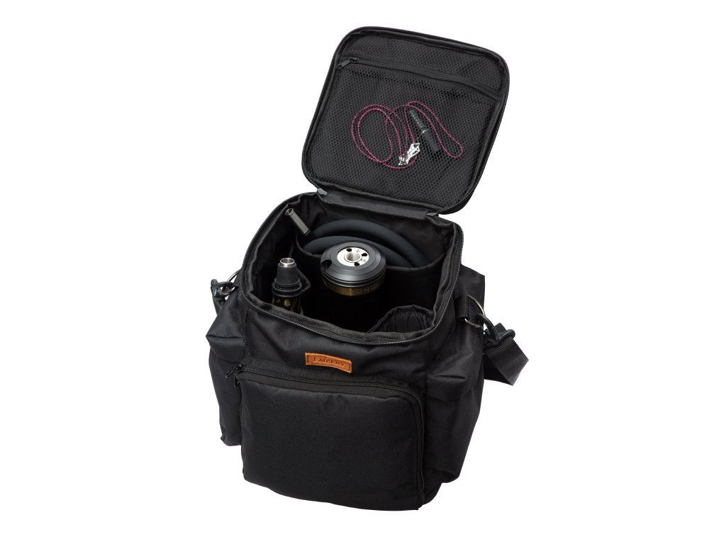 Taška je ušitá z odolného voděodolného nylonu, takže zvládne běžné cestování, auto, terasu i přenášení venku. Uvnitř najdeš silné a měkké vnitřní stěny, které tlumí nárazy a chrání dýmku při manipulaci. Velké plus je i spousta kapes – jednoduše si zorganizuješ hadici, náustek, drobnosti a vejde se i příslušenství včetně uhlíků a tabáku, takže jedeš „na jistotu“ bez dalšího zavazadla.